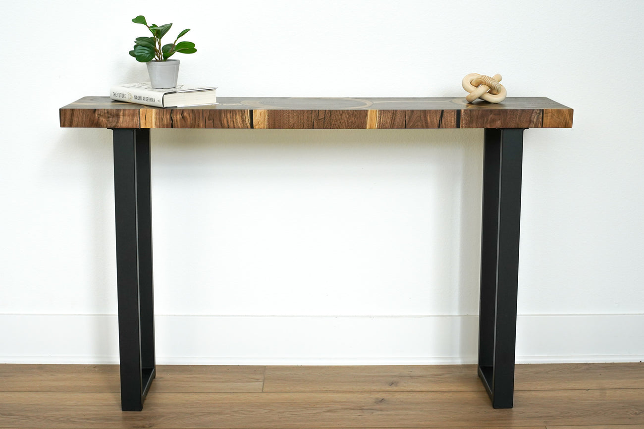 Add a touch of natural beauty to your living space with our Eclipse Collection. Handcrafted by skilled artisans, the eclipse console table showcases walnut heartwood and sapwood interlocking creating a one of a kind piece of art.