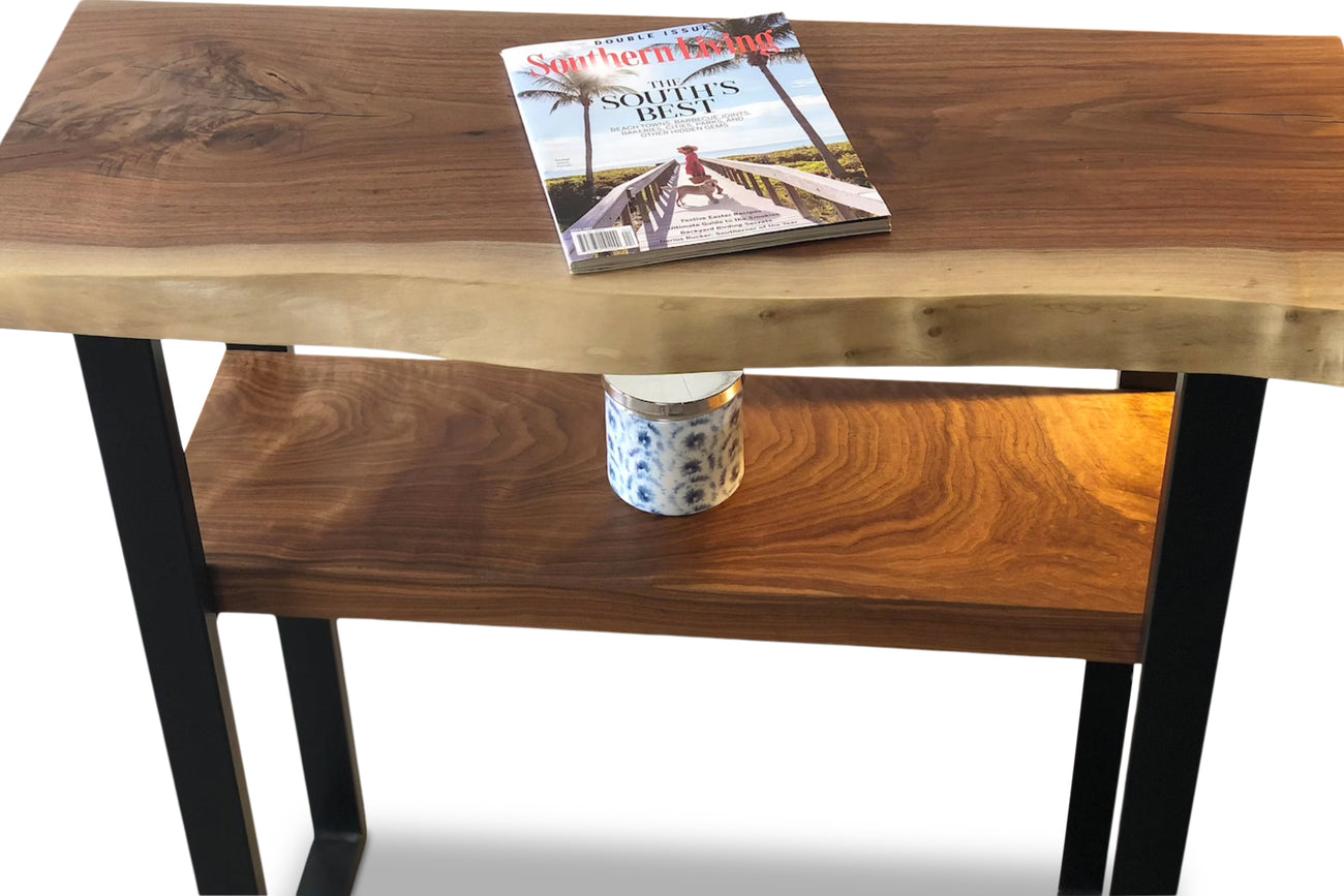 This stylish black walnut live edge sofa table is furnished with a flat edge shelf that will bring a warm natural feel to any area of your home and last a lifetime. Pictured is this beautiful 30" inch tall table with shelf features a 36" inch long black walnut live edge slab with a 30" solid walnut shelf. Live edge width will be 10-14 deep depending on the character of the wood.