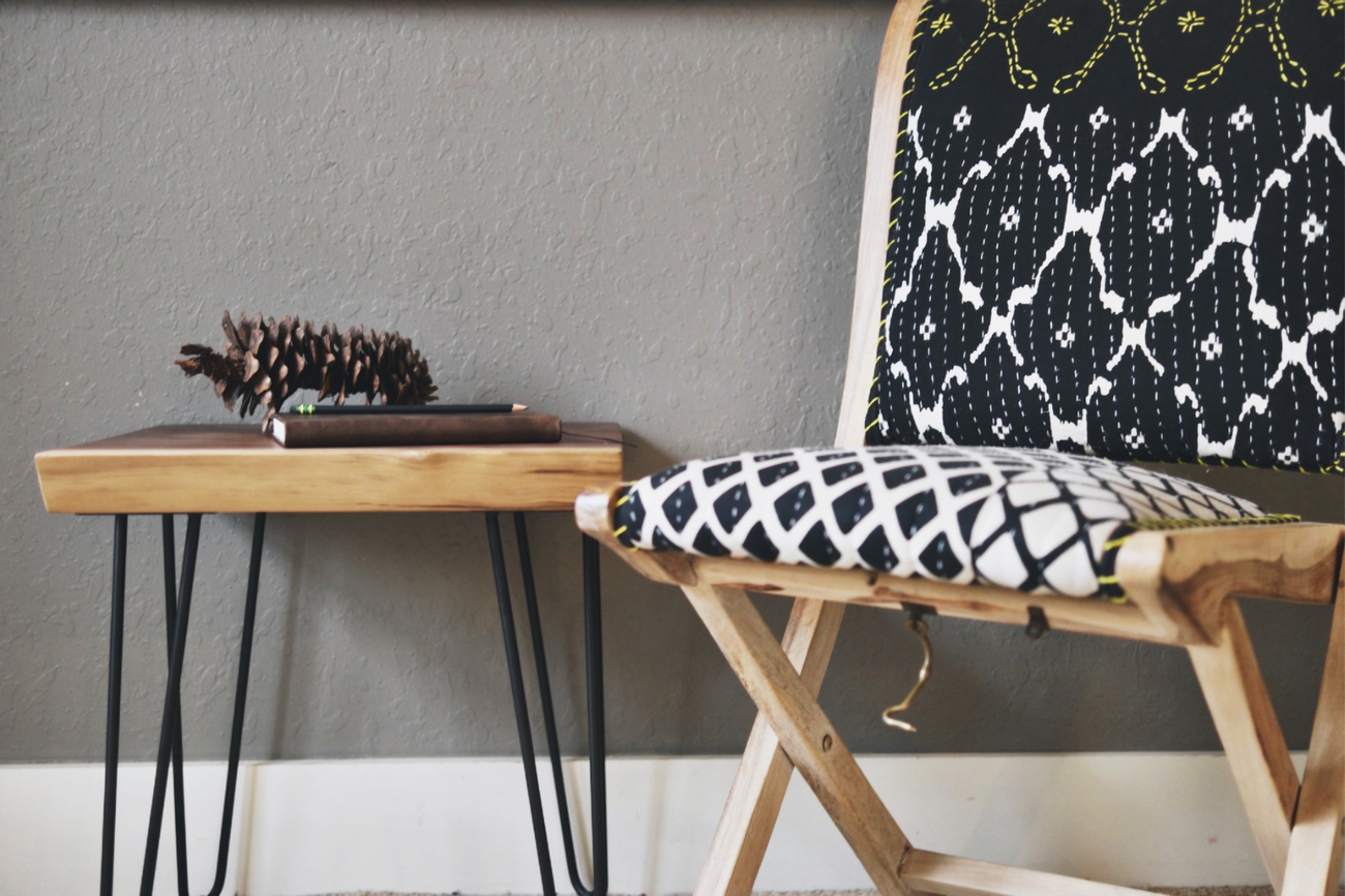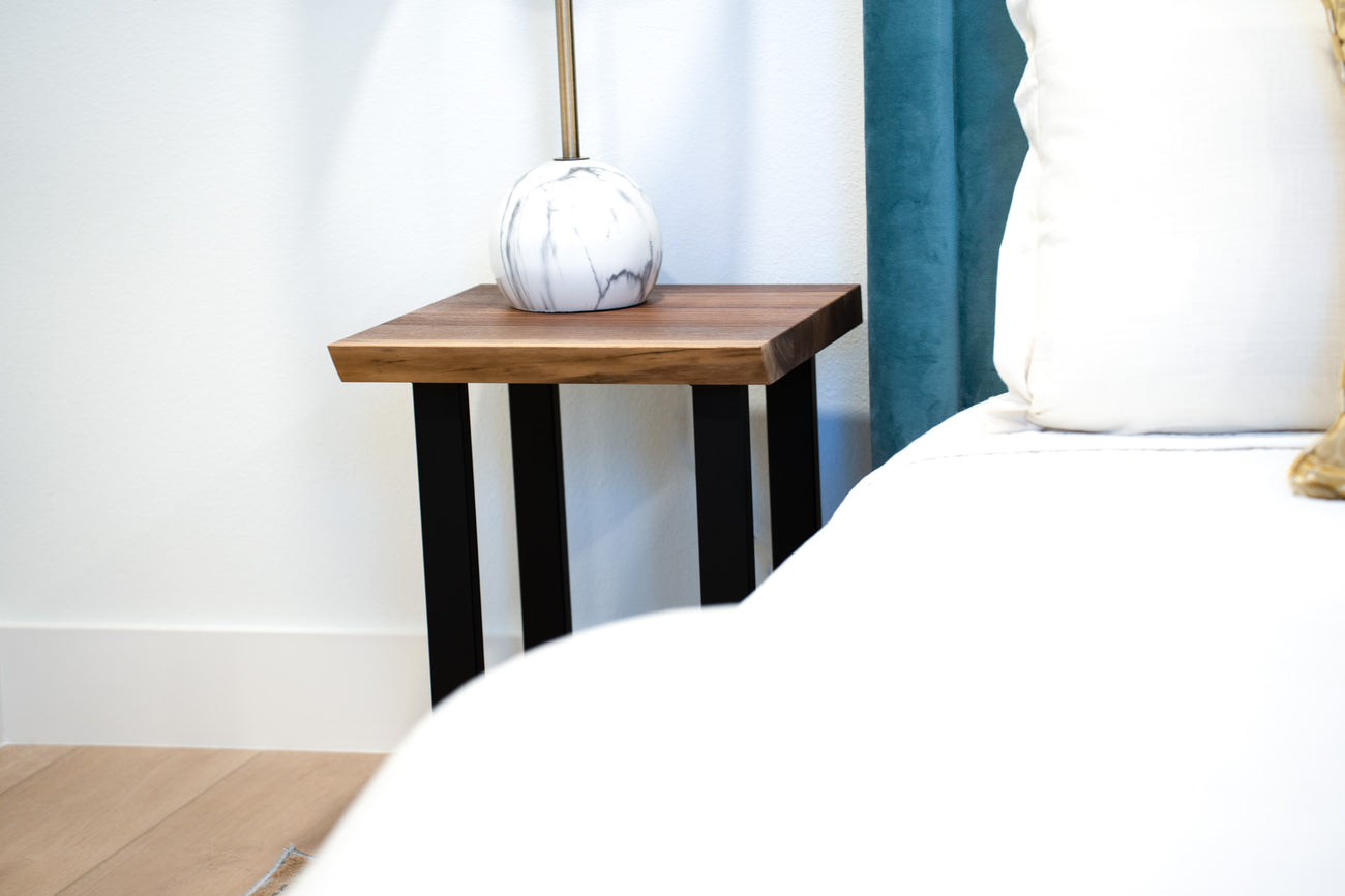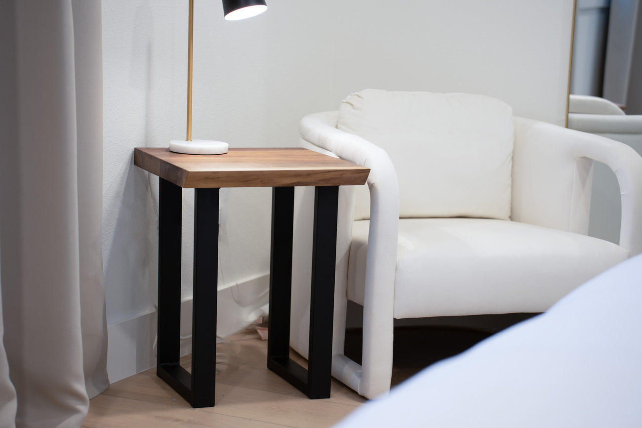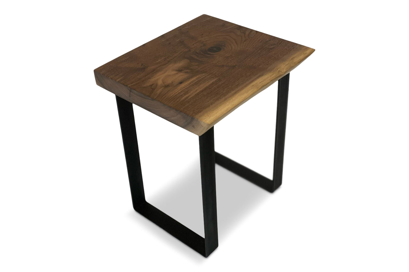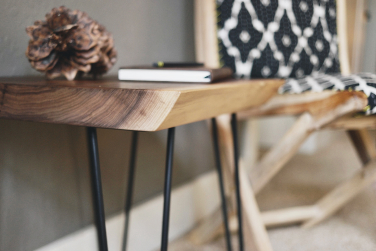 This end table does double between our comfy chairs. Perfect for two mugs of coffee, a couple pair of eyeglasses and the remote. And notice the beautiful custom made live edge table behind the chairs. We couldn’t be happier with these tables. They are functional and beautiful works of art. Thank you Artisan Born!