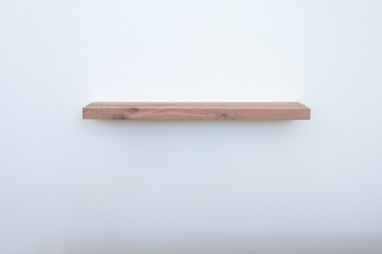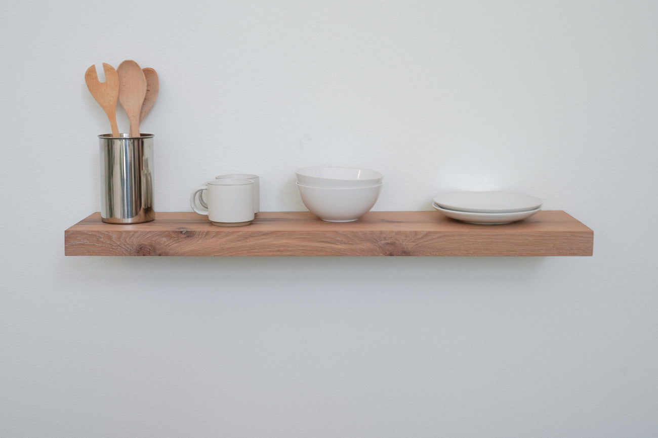 Our beautiful natural oak floating shelves are handcrafted in the USA and are designed to add a clean modern look to any space. These shelves are built from solid white oak and colored with a VOC-free, non-toxic, and eco-friendly natural oak finish. Knotholes, voids, and cracks on the surface are filled to bring out the natural beauty of the piece. All of our shelves come in multiple sizes and include Easy Mount hardware for a fast and simple installation.