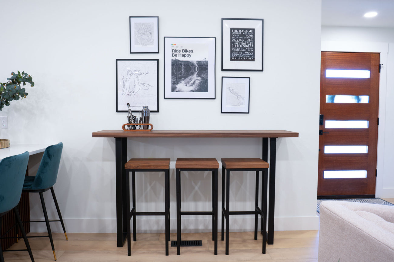 This solid premium black walnut bar is sturdy and has gorgeous wood grain. Great for a variety of spaces and can be used as a Bar top, console table & high top table. Customize the size to fit your needs, Every piece is unique and will vary slightly in character. Knotholes, voids, and cracks on the surface are filled to bring out the natural beauty of the piece. Choose from wood from Walnut or White Oak.