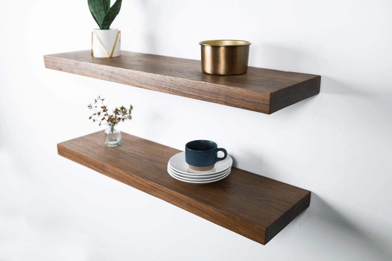 Bring home the beauty of nature with our handmade solid walnut floating shelves. Our beautiful floating shelves are handcrafted from solid Walnut and will add a warm rustic feel to any space. Knotholes, voids, and cracks on the surface are filled to bring out the natural beauty of the piece.