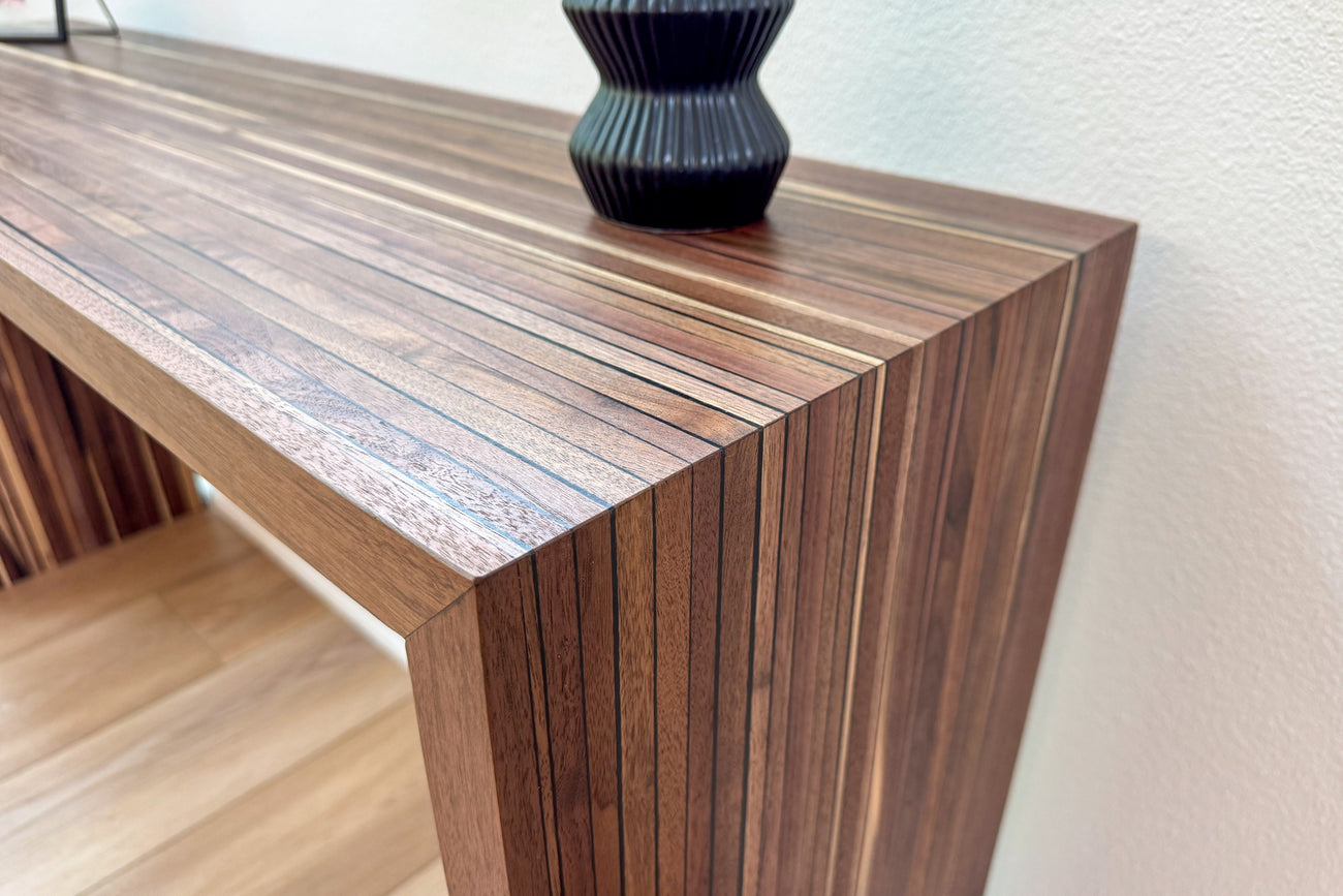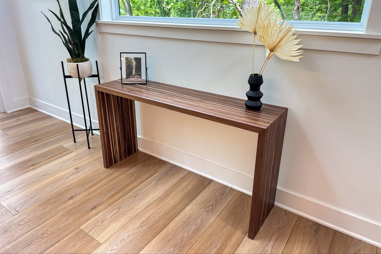 Our Demi Collection Console Tables are constructed with strips of solid black walnut, chosen to showcase the gorgeous wood grain and deep walnut color. Black epoxy has been added for color and durability, creating subtle contrast while strengthening the build.