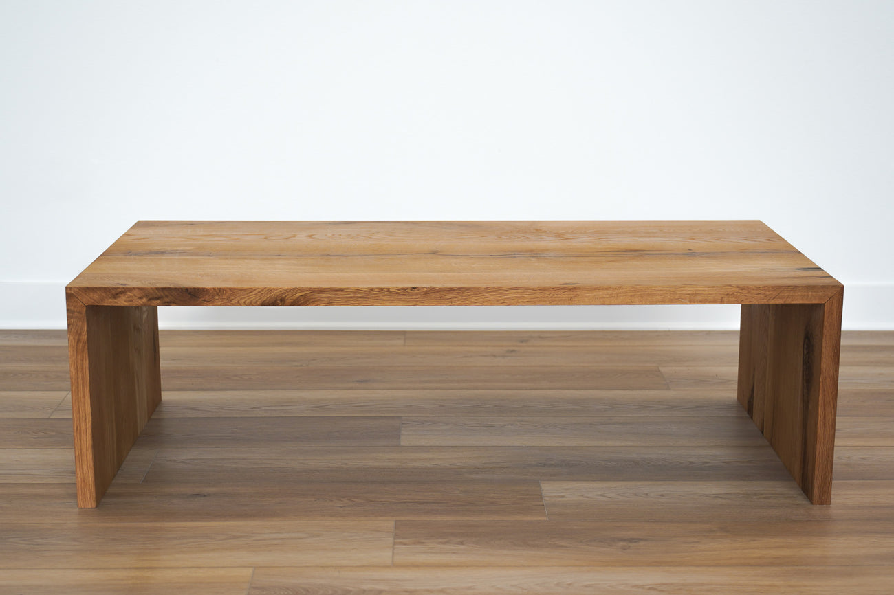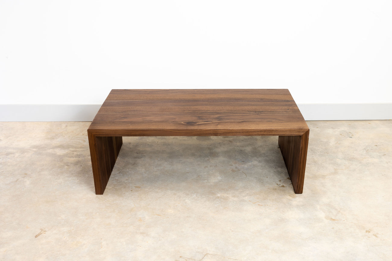 This modern waterfall coffee table is crafted from premium, solid black walnut or Oak wood. Every piece is unique. Proudly made in the USA, this is a sturdy, stylish heirloom piece that will last – and be loved – for generations.