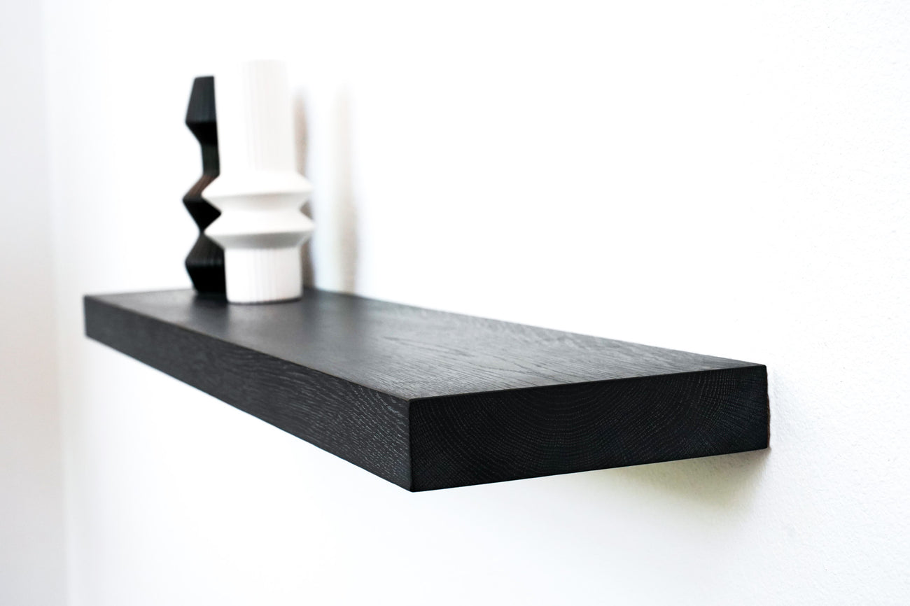 Our beautiful black floating shelves are handcrafted in the USA and are designed to add a clean modern look to any space. These shelves are built from solid white oak and colored with a VOC-free, non-toxic, and eco-friendly black finish. Knotholes, voids, and cracks on the surface are filled to bring out the natural beauty of the piece. All of our shelves come in multiple sizes and include Easy Mount hardware for a fast and simple installation.