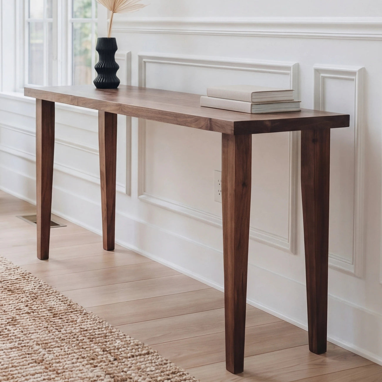 Most furniture is made to fit a box. Our walnut console table is made just for your home. This solid walnut console table is handcrafted to your exact dimensions and leg style, so you get a piece that looks like it was always meant to be there — because it was.