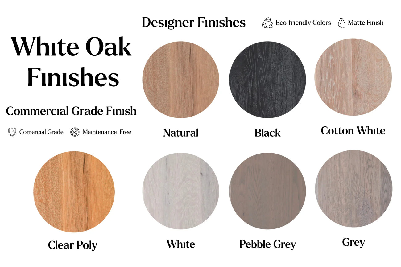 White Oak is finished with Satin Polyurethane — a smooth, durable topcoat that protects the wood while preserving its natural look and feel. Water and heat resistant, easy to clean, and built for daily use.