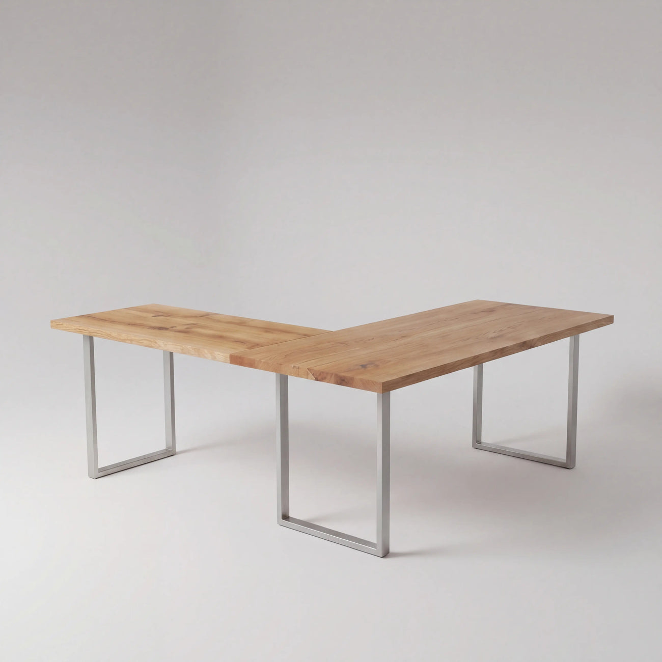 A generous main surface for your primary setup, a return for everything else. Both built from 100% solid white oak, handcrafted to your exact dimensions, and finished to last for decades.