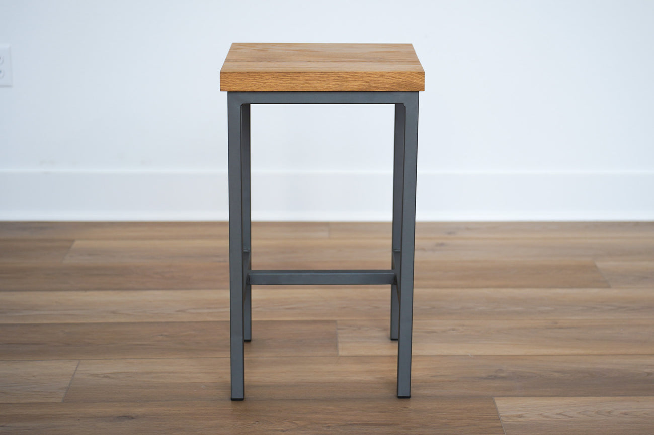 Pictured in: White Oak 26" (counter Height) in hammered Steel painted base.
