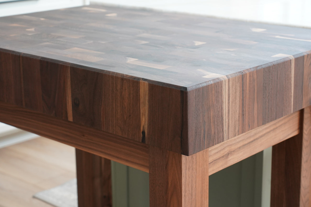 Upgrade your kitchen with our 5" Solid Walnut Butcher Block kitchen island, built to last generations by our furniture artisans in the heart of the Ozarks. Our butcher block end grain construction style, absorbs cuts efficiently leaving minimal marks, extending the life of your knives and offers a degree of self-healing as wood fibers spring back after being cut.